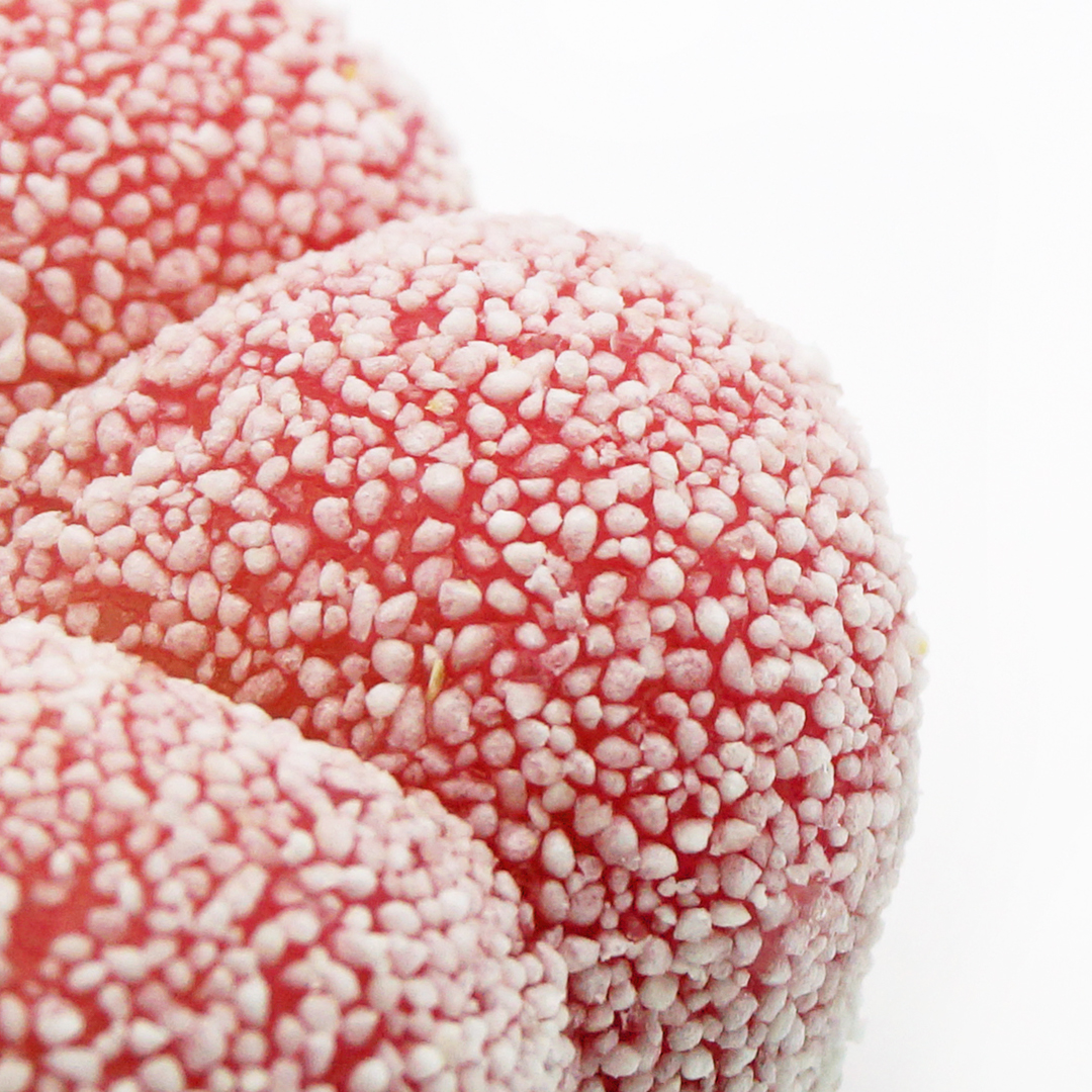 Le parfum de la pâtisserie est neutre, et l’on y reconnaît seulement l’odeur de la pâte de riz. Cette dernière est colorée en rose, mate à sa surface et brillante sur sa tranche que l’on aperçoit lors de la découpe. Elle est plus épaisse à la base du dessert qu’à sa surface et sa texture caractéristique est proche d’une texture gélifiée tout en étant très élastique. Sa surface est recouverte de petits granules sans saveur particulière qui en facilitent la manipulation sans qu’elle ne colle aux doigts et qui la texturent agréablement.